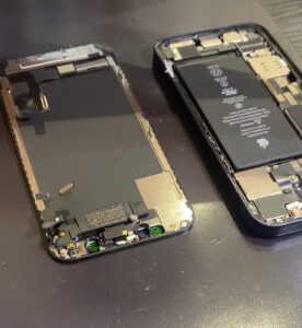例えば、浴槽に落としてしまった iPhone 12 mini が水没し、内部に水が入りカメラが曇ったケースでは、まず基板を取り外して内部を洗浄し、不純物を丁寧に除去しました。