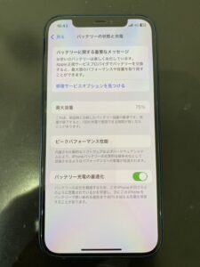 お使いの端末はとても綺麗に保たれていましたが、バッテリーの最大容量が75%まで下がっており、すぐに電池が切れてしまう状態でした。