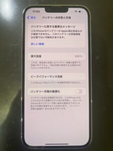 交換後は、バッテリーの最大容量や状態を設定アプリで確認しましょう。
